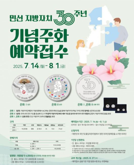 한국조폐공사는 민선 지방자치제도의 출발점인 '제1회 전국동시지방선거' 실시 30주년을 기념해 액면가 7만원의 '민선 지방자치 30주년 기념주화'를 발행(한국은행)·판매한다고 14일 밝혔다.