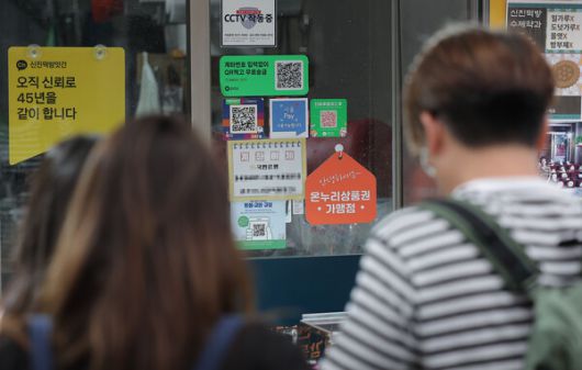 정부가 민생회복 소비쿠폰 1차 지급계획을 발표한 6일 서울의 한 전통시장 점포에 기존 골목경제 소비 활성화를 위한 온누리상품권 가맹 팻말이 붙어 있다. 경기 진작을 위한 이재명 정부의 첫 민생회복 소비쿠폰 신청과 지급이 이달 21일부터 9월 12일까지 8주간 이뤄진다. [사진: 연합뉴스] |