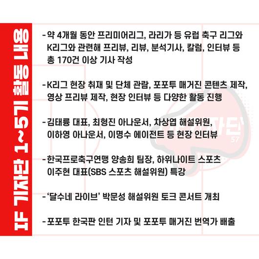 또한, 활동기간 동안 K리그 현장 취재 및 단체 관람, 포포투 매거진 콘텐츠 제작, 영상 프리뷰 제작, 현장 인터뷰 등 다양한 활동을 했고, 지난 4기 해단식 날에는 '달수네 라이브' 박문성 해설위원의 축구 산업과 관련해 토크 콘서트를 진행하기도 했다.