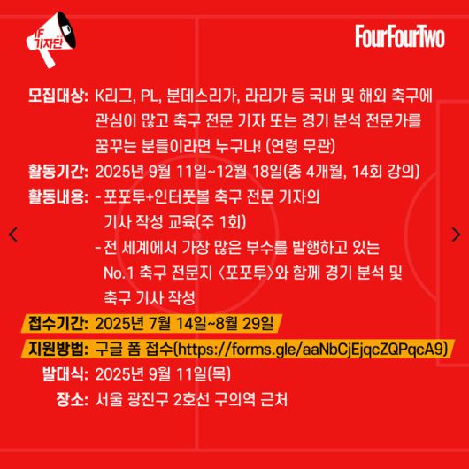 [인터풋볼] 차윤정= 전 세계에서 가장 많은 부수를 발행하고 있는 'No.1' 축구 전문지 포포투가 축구 전문 기자 아카데미 6기를 모집한다.