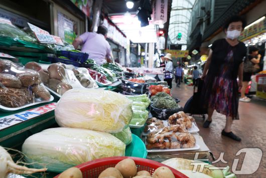 (수원=뉴스1) 김영운 기자 = 역대급 무더위와 이상고온이 작황과 어획량에 영향을 미치며 폭염에 따른 물가 상승을 뜻하는 '히트플레이션(폭염+인플레이션)' 우려가 커지고 있는 가운데 14일 경기 수원시 팔달구 못골시장에 채소가 진열되어 있다. 2025.7.14/뉴스1