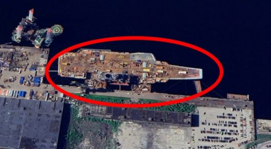 러시아군이 보유한 유일한 항공모함(사진)이 가까운 시일 내에 폐기될 위기에 처했다. 사진은 2022년 5월 20일 아드미랄 쿠즈네초프 항공모함을 담은 위성 사진. 구글 어스 제공 |