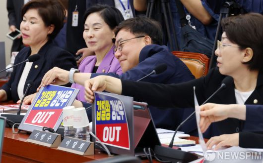 [서울=뉴스핌] 정일구 기자 = 14일 오전 서울 여의도 국회 여성가족위원회에서 열린 강선우 여성가족부 장관 후보자 인사청문회에서 국민의힘 의원들이 이인선 위원장의 중재 하에 피켓을 떼고 있다. 2025.07.14 mironj19@newspim.com |