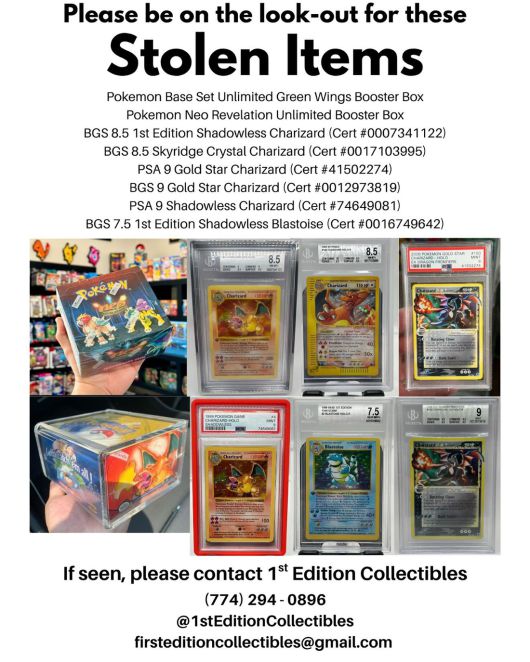 도둑이 가져간 물품에는 ‘그림자 없는 리자몽’ 카드 초판과 ‘그림자 없는 거북왕’ 카드 초판 등이 포함돼 있다. 리자몽과 거북왕은 포켓몬의 대표 캐릭터인 파이리와 꼬부기의 최종진화형 캐릭터들이다. 두 카드는 카드 그레이딩 업체인 BGS로부터 7.5~8.5점을 받은 것으로 알려졌다. 카드 그레이딩은 등급을 매겨 카드 소장가치를 공인받는 것으로, 10점이 가장 높은 점수다. 카드가 희귀할수록, 미개봉 상태일수록 소장가치가 커진다.