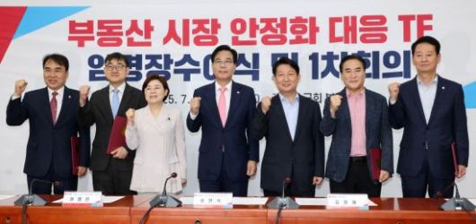 송언석 국민의힘 비상대책위원장 겸 원내대표(가운데)와 참석자들이 14일 국회에서 열린 부동산 시장 안정화 대응 TF 임명장 수여식 및 1차 회의에서 파이팅을 외치고 있다. <ⓒ투자가를 위한 경제콘텐츠 플랫폼, 아시아경제(www.asiae.co.kr) 무단전재 배포금지>
