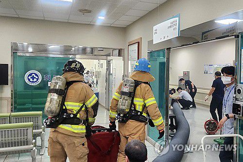 (광주=연합뉴스) 14일 오전 광주 동구 조선대병원에서 불이 나 10여분 만에 자체 진화됐다. 사진은 소방대원들이 화재 수습을 위해 수술실 내부 연기를 빼내는 모습. 2025.7.14 [광주 동구 제공. 재판매 및 DB 금지]