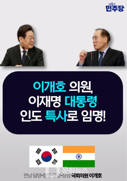 [이동구 기자] (문화뉴스 이동구 기자) 이재명 대통령이 7월 중 미국, 일본, 중국, 유럽연합(EU), 독일, 프랑스, 호주, 인도, 캐나다, 폴란드 등 주요국에 특사를 파견할 계획인 가운데 더불어민주당 이개호 국회의원(전남 담양·함평·영광·장성)이 인도 특사로 낙점되면서 정치권과 외교 현장에서 비상한 관심을 받고 있다.