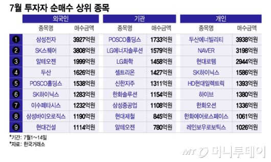 7월 투자자 순매수 상위 종목/그래픽=이지혜 |