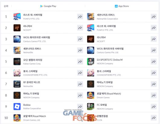 구글 플레이에서는 '라스트 워: 서바이벌'이 1위를 차지했다. '리니지M'과 '화이트아웃 서바이벌', '세븐나이츠 리버스'와 '오딘: 발할라 라이징'이 그 뒤를 추격하며 TOP 5를 형성하고 있다. '페이트/스테이 나이트' 컬래버레이션 효과로 순위가 대폭 상승한 '붕괴: 스타레일'이 TOP 10 재진입에 성공한 반면, 'RF 온라인 넥스트'와 '마비노기 모바일'은 소폭 순위가 하락했으나 여전히 TOP 10을 유지하고 있다.