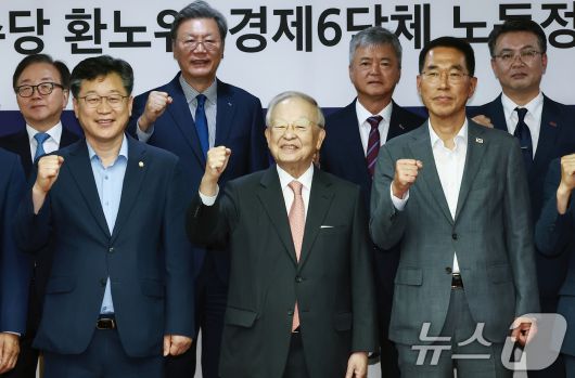 (서울=뉴스1) 김민지 기자 = 안호영 국회 환경노동위원장과 손경식 한국경영자총협회장을 비롯한 참석자들이 14일 오후 서울 마포구 한국경영자총협회에서 열린 '더불어민주당 환경노동위원회·경제6단체 노동정책 간담회'에서 기념촬영을 하고 있다. 오른쪽은 김주영 환노위 여당 간사. 2025.7.14/뉴스1