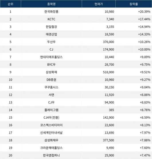 6위 CJ(001040)는 종가 174,900원으로 10.00% 상승 마감했다. 7위 현대지에프홀딩스(005440)는 종가 10,440원으로 9.89% 상승 마감했다. 8위 BYC우(001465)는 종가 28,700원으로 9.75% 상승 마감했다. 9위 삼성화재(000810)는 종가 518,000원으로 9.51% 상승 마감했다. 10위 DB증권(016610)은 종가 10,960원으로 9.27% 상승 마감했다.