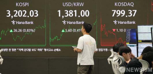 [서울=뉴스핌] 양윤모 기자 = 14일 오후 코스피가 전장 종가보다 26.26포인트(0.83%) 상승하며 3202.03으로, 코스닥은 1.10포인트(0.14%) 하락한 799.37로 마감한 가운데, 서울 중구 하나은행 딜링룸에서 직원들이 업무를 보고 있다. 서울외환시장에서 원·달러 환율은 전장 대비 5.60원 상승한 1381.00원에 거래를 마감했다. 2025.07.14 yym58@newspim.com