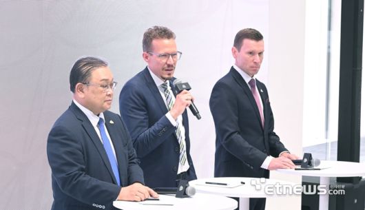 메르세데스-벤츠가 서울 강남구 압구정로에 '마이바흐 브랜드센터 서울'을 세계 최초로 오픈했다. 14일 마이바흐 브랜드센터 서울에서 기자간담회가 열리고 있다. 왼쪽부터 노재봉 HS효성 대표이사, 마티아스 가이젠 메르세데스-벤츠그룹 AG이사회 멤버 겸 마케팅&세일즈 총괄, 마티아스 바이틀 메르세데스-벤츠코리아 대표가 마이바흐 브랜드 전략을 발표하고 있다.박지호기자 jihopress@etnews.com |
