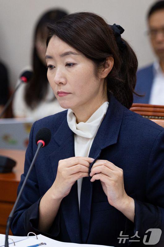 (서울=뉴스1) 유승관 기자 = 강선우 여성가족부 장관 후보자가 14일 서울 여의도 국회에서 열린 인사청문회에 출석해 국무위원 후보자가 국회의원 배지를 달고 있는 것에 대해 이인선 위원장이 적절치 못하다고 지적하자 국회의원 배지를 내려 놓고 있다. 2025.7.14/뉴스1