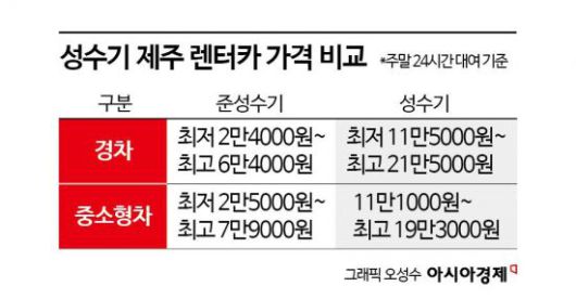 준성수기로 분류하는 이달 중순 같은 차종의 주말 하루 대여료가 최저 2만4000원에서 최고 6만4000원으로 책정된 것과 비교하면 3~5배가량 상승한 것이다. 같은 기간 중·소형차의 주말 하루 대여료도 최저 11만1000원에서 최고 19만3000원으로 준성수기보다 2.5배에서 4배가량 비싸다.