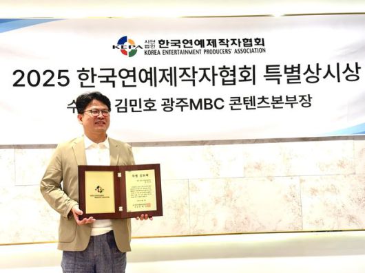 [OSEN=장우영 기자] 김민호 광주문화방송(광주MBC) 콘텐츠본부장이 한국연예제작자협회(회장 임백운)로부터 ‘특별 공로상’을 수상했다. 이 상은 한국 대중문화 및 연예 산업의 발전에 기여한 인물에게 수여되는 영예로 김 본부장의 30여 년에 걸친 방송 제작 활동과 창의적 기획력을 높이 평가한 결과다.