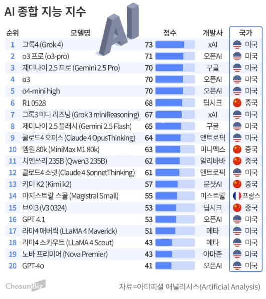 6위는 중국 딥시크(DeepSeek)의 R10528 모델(68점)로, 이외에도 알리바바의 치엔쓰리(Qwen3), 미니맥스(MiniMax), 문샷AI의 키미 K2(Kimi K2), 딥시크 V3(DeepSeek V3) 등이 상위 20위권에 포함됐다. 미국은 그록, GPT, 클로드, 제미나이, 라마 등 총 14개 모델을 배출하며 기술 주도권을 지켰고, 중국은 총 5개 모델로 그 뒤를 이은 것이다. 프랑스 미스트랄(Mistral AI)의 마지스트랄 스몰(Magistral Small)만이 유일하게 미·중 이외 국가에서 순위에 이름을 올렸다.