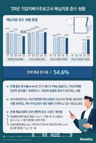 한국 딜로이트 그룹의 기업지배기구발전센터는 14일 국내 유가증권 상장법인의 지배구조 운영 현황을 분석한 ‘기업지배기구 데이터 동향’ 제5호를 발간하고, 기업지배구조 핵심지표 평균 준수율은 54.6%로, 전년 대비 5.1%포인트 상승하며 개선세를 보였다고 밝혔다.