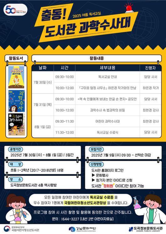 도곡정보문화도서관에서 초등학생 1∼2학년 대상 여름 독서교실 ‘출동! 도서관 과학수사대’를 7월30일(수)부터 8월1일(금)까지 운영한다. ‘과학수사’를 주제로 활동도서를 함께 읽고, 과학수사와 법과학 관련 독후활동을 진행할 예정이다. 첫날에는 ‘구미호 탐정 사무소’ 하은경 작가와 함께 이야기에 등장하는 탐정과 추리소설작가라는 직업 세계를 알아보고, 둘째 날에는 최현경 강사(위드이룸 사이언스 대표)와 혈흔 감식, 지문 감식, 프로파일링 등 다양한 수사 기법에 대해 알아본다. 마지막 날에는 직접 과학수사 보고서를 작성하고 혼합물을 분석해보며 스릴 넘치는 범인 찾기 체험 활동을 진행한다. 독서교실에 참여한 학생들에게는 기념품이 제공되며, 우수 참여자 1명에게 국립어린이청소년도서관장상이 수여된다. 신청은 도곡정보문화도서관 누리집(library.gangnam.go.kr/dogoklib)에서 가능하다. 문의 1644-3227(내선 2번 어린이자료실).