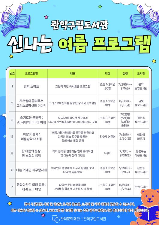이 밖에도 △‘방학스타트’(관악중앙도서관, 7월15일 모집 예정) △‘한여름의 문장, 한 소절의 음악’(용꿈도서관) △‘세계 요리 여행’(조원도서관) 등 각 도서관별로 다양한 주제와 체험 요소를 결합한 프로그램을 운영한다.