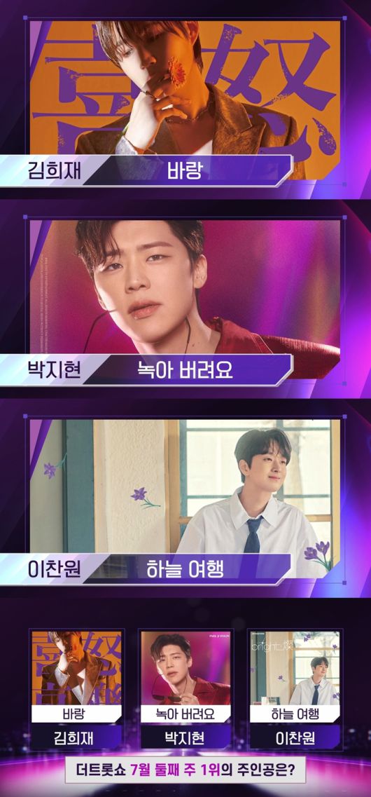 지난주에 이어 ‘바랑’으로 2주 연속 1위에 도전하는 김희재를 비롯해, 오랜 시간 사랑 받고 있는 이찬원의 ‘하늘 여행’이 후보에 올랐다.