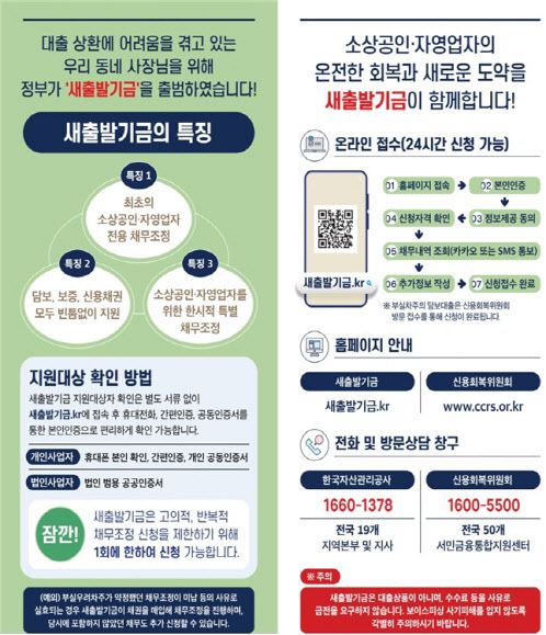 금융위 관계자는 “약 150만명의 제로페이 가맹점주에게 메시지를 발송하는 등 관련 채널을 적극 활용하고, 개인채무자보호범에 따라 연체자에게 채무조정 제도 안내 시 새출발기금도 함께 안내할 계획”이라고 했다.