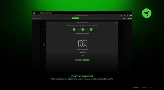 사용 중인 레이저 게이밍 마우스를 데스에더 V4 프로로 빠르게 변경할 수 있도록 돕는 기능은 감도 매칭 기능도 제공한다.
