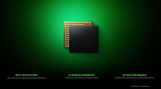 이번 게이밍 마우스는 기존 세대의 55nm/50nm 공정이 아닌 22nm 공정으로 제작됐다. CPU나 그래픽카드에서도 더 세밀한 공정이 전력 대비 성능을 극대화하는 것처럼, 게이밍 마우스에서도 더 작은 트랜지스터 사용과 전력 소비량을 줄이는데 기여할 수 있게 됐다. 이를 통해 6배에 달하는 피크 퍼포먼스를 구현할 수 있게 됐다.