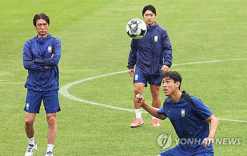 (성남=연합뉴스) 홍기원 기자 = 2025년 동아시아축구연맹(EAFF) E-1 챔피언십(동아시안컵) 남자부 3차전 일본과의 경기를 앞둔 축구 국가대표팀 홍명보 감독이 14일 경기도 성남종합운동장에서 훈련하는 오세훈을 지켜보고 있다. 2025.7.14