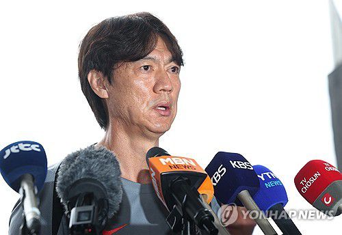 (성남=연합뉴스) 홍기원 기자 = 2025년 동아시아축구연맹(EAFF) E-1 챔피언십(동아시안컵) 남자부 3차전 일본과의 경기를 앞둔 축구 국가대표팀 홍명보 감독이 14일 경기도 성남종합운동장에서 훈련에 앞서 취재진 질문에 답하고 있다. 2025.7.14