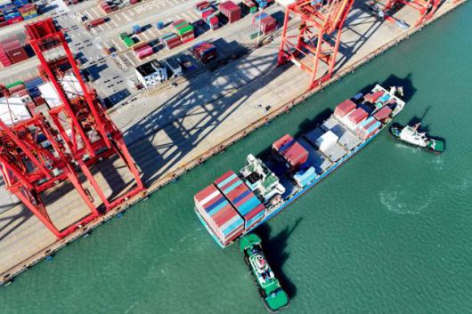 컨테이너를 실은 선박이 14일 중국 동부 장쑤성 롄윈강 항구에 정박해 있다. 롄윈강=AFP 연합뉴스 |