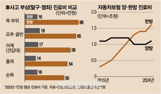 한방 치료비가 높은 것은 경상환자에게도 한약부터 추나 치료에 이르는 세트 처방을 하는 사례가 많기 때문으로 지적됐다. 상해급수 12~14급에 해당하는 경상환자가 자동차보험으로 한방 치료를 받은 금액은 작년 1조323억원으로 양방 치료 2724억원의 4배에 달했다.