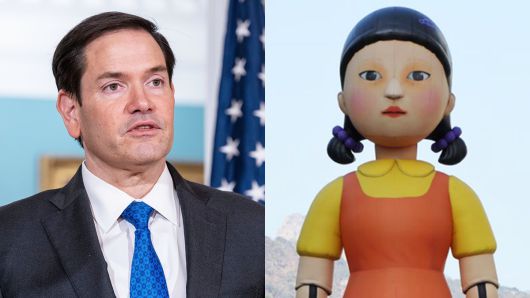 마코 루비오 미 국무장관 겸 국가안보보좌관. 오른쪽은 오징어게임의 영희 캐릭터. |