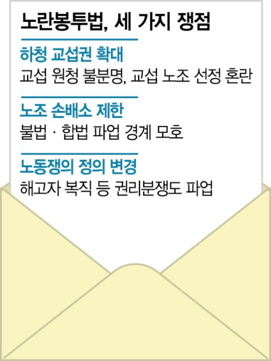 노란봉투법의 쟁점은 크게 세 가지다. 하청 근로자가 원청과 교섭이 가능한지, 노동조합에 대한 과도한 손해배상 소송을 제한해야 하는지, 이익 분쟁만 가능하던 쟁의 대상에 권리 분쟁을 포함할 수 있을지다. 이 교수는 “원청이 사실상 (하청 근로자의) 임금과 근로조건을 결정하고 있는 상황에서 (하청 근로자의) 교섭권을 보장하는 것은 시대적 과제”라면서도 “하청 교섭이 경제에 미치는 영향을 최소화하는 게 필요하다”고 말했다. 경영계 역시 노란봉투법이 기업 경영에 악영향을 끼칠 수 있다고 우려한다. 하청 노조가 원청과의 교섭이 막힐 경우 선택할 수 있는 파업의 횟수와 기간이 모두 길어질 수 있다는 지적이다. 이 상황의 ‘완충장치’는 노조의 불법 파업에 대한 소송인데, 노란봉투법은 이러한 소송도 제한한다. 반면 노동계는 하청 노조가 원청과 교섭이 가능해지면 파업이 되레 줄어들 수 있다고 반박한다.