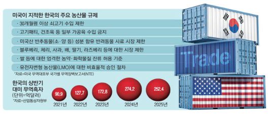 제도 선진화와 국내 소비자들에게 도움이 될 수 있는 방식으로 농산물에 대한 빗장을 풀고, 이를 지렛대 삼아 트럼프 관세 '대못'을 뽑겠다는 포석이다. 한미 관세협상이 시작된 이후 통상당국이 농산물 시장 개방 가능성을 언급한 것은 이번이 처음이다. 미국 무역대표부(USTR)는 지난 3월 공개한 '2025년도 국가별 무역장벽보고서(NTE)'에서 △30개월령 이상 쇠고기 수입 제한 △고기패티·건조육 등 가공육 수입 금지 △블루베리, 체리, 사과, 배, 딸기, 라즈베리 등에 대한 시장 제한 △유전자변형 농산물(LMO)에 대한 비효율적 승인 절차 등을 거론하고 있다.