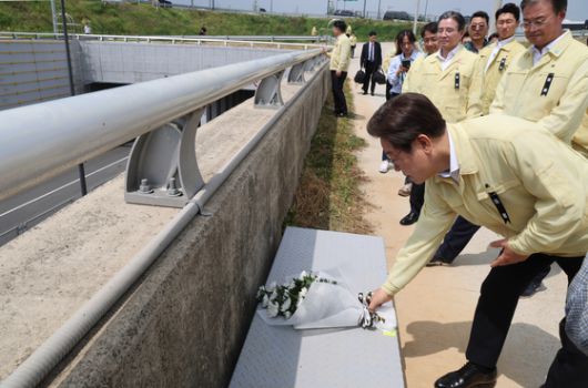 이재명 대통령이 14일 오후 지난 2023년 7월15일 내린 폭우로 침수돼 14명이 사망한 충북 청주시 오송읍 궁평2지하차도 사고현장을 방문해 헌화하고 있다. 대통령실사진기자단 |