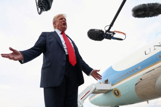 13일(현지시간) 미국 메릴랜드주 앤드루스 합동기지에서 도널드 트럼프 미국 대통령이 취재진의 질문에 답하고 있다. [로이터=연합뉴스]