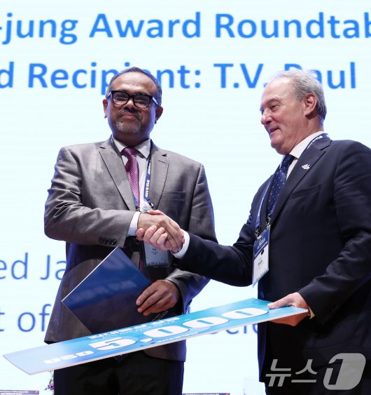 (서울=뉴스1) 오대일 기자 = 14일 오후 서울 강남구 코엑스에서 열린 제1회 김대중상(The Kim Dae-jung Award) 시상식에서 초대 수상자로 선정된 캐나다 몬트리올 맥길대학교의 T. V. 폴(Paul) 석좌교수(왼쪽)가 파블로 오냐테 세계정치학회 회장으로부터 상장과 상금을 수여받고 있다. 김대중상은 세계정치학회(IPSA)가 고(故) 김대중 대통령 탄생 100주년을 기념해 제정한 상으로, 세계 평화, 민주주의, 인권 증진에 학문적 공로를 세운 학자를 선정해 수여된다. 2025.7.14/뉴스1
