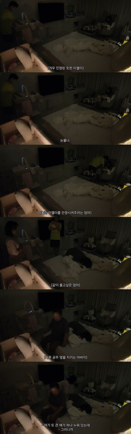 계속 울던 이엘이 품 안에서 겨우 진정이 된 듯하자 이수민은 "눈물 나"라며 힘든 기색을 표했고, 이에 원혁은 "괜찮아, 자기야. 애기들 원래 다 그래. 많이 힘들었지?"라고 하며 아내를 안아줬다.