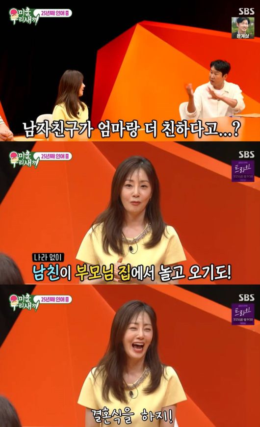 이날 오나라는 김도훈에 대해 "저희 엄마랑 궁합이 잘 맞는 것 같다. 엄마 아빠 대신 혼자 놀다 오기도 한다. 챙겨주니까 너무 고맙다"라고 애정을 드러내는가 하면 "결혼을 하든 안 하든 잘 만나고 행복하니까 필요성을 못 느끼는 것 같다. 언젠가는 하겠죠?"라고 솔직하게 말했다.