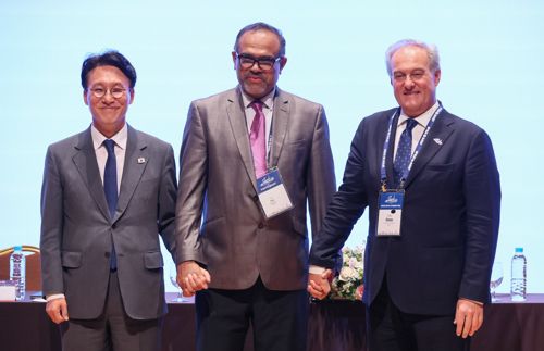 김민석 국무총리(왼쪽)가 14일 서울 강남구 코엑스에서 세계정치학회와 김대중재단 공동 주최로 열린 제1회 김대중상 시상식에서 수상자인 T. V. 폴 캐나다 맥길대학교 정치학과 교수(가운데), 파블로 오냐테 세계정치학회장과 기념촬영을 하고 있다. [사진 제공] 연합뉴스 |