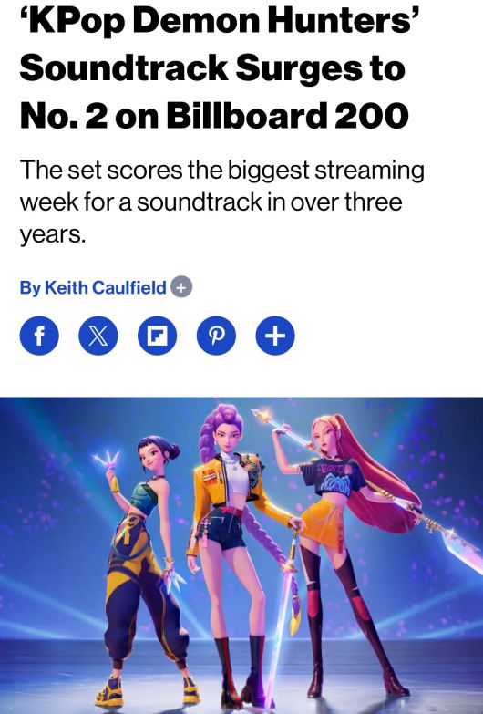 빌보드는 "'케이팝 데몬 헌터스'는 '가디언즈 오브 갤럭시'(2017년) 이후 톱 10으로 데뷔하고 이후 2~3주차에 앨범 유닛 상승을 보인 최초의 OST가 됐다"고 소개했다.