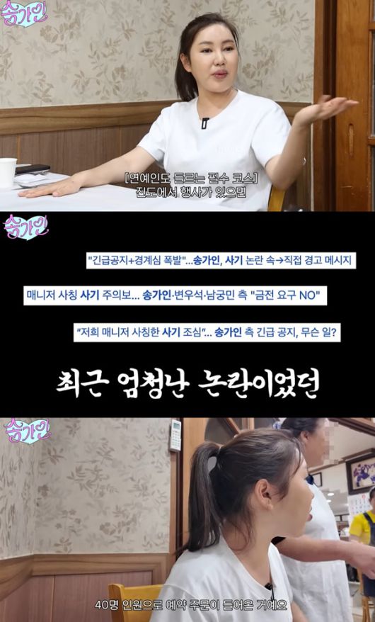 맛있게 식사를 즐기던 송가인은 "식당 이모한테 40명 인원 예약이 들어왔다더라. 알고봤더니 사기였다"고 노쇼 사기 사건을 언급했다.