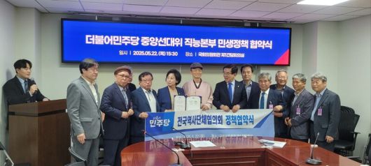 지난 5월22일 전국역사단체협의회와 더불어민주당 중앙선대위 직능본부 민생정책 협약식 모습. 가운데 개량한복 입은 이가 김민곤 역단협 대표, 왼쪽이 남인순, 오른쪽이 정일영 국회의원이다. 역사정상화전국연대 제공 |
