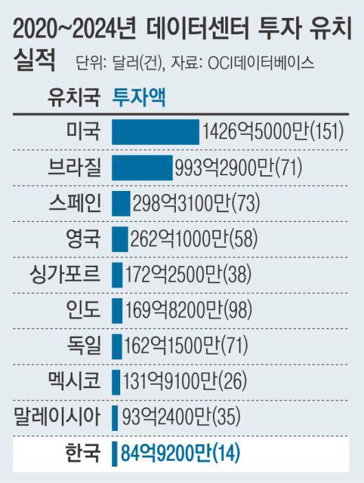 그러나 한국은 국내외 투자 부진과 수도권 과밀화 등으로 데이터센터 산업의 경쟁력이 높지 않은 편이라고 보고서는 평가했다. 보고서는 “최근 5년 기준 한국 기업이 해외에서 투자받은 데이터센터 투자 유치액은 약 85억달러로 미국 기업이 받은 금액의 5.95%에 불과하다”고 밝혔다. 또 데이터센터를 구축하는 데 국산 장비 활용률도 낮고, 입지도 수도권 집중으로 전력망 부담이 심화하는 점도 과제로 꼽힌다.