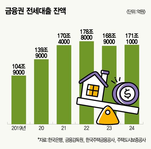 한국은행과 금융감독원, 주택도시보증공사(HUG) 등에 따르면, 2019년 104조9000억원에 그쳤던 금융권 전세대출 잔액은 지난해 171조1000억원으로 5년 새 63% 급증했다. 올해는 200조원에 육박할 것으로 보인다. 다만 전세대출은 이자만 상환하기 때문에 주담대와 달리 상환 부담이 낮아 DSR 규제를 하더라도 큰 효과가 없다는 지적도 많다. 이 때문에 6억원 초과 주담대 제한처럼 전세대출도 아예 상한 금액을 설정할 것이란 얘기도 들려온다. 문재인정부 시절 나왔던 1주택 이상 보유자 전세대출 금지 방안도 거론된다. 갭투자로 서울 고가 아파트를 사고, 본인은 전세대출을 받아 다른 지역에 거주하는 것을 막겠다는 취지다.