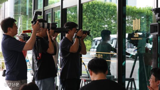 오지 않는 ‘윤’을 기다리며 윤석열 전 대통령이 소환 조사에 재차 불응한 14일 취재진이 내란 특검 사무실이 있는 서울 서초구 서울고검 청사 내부를 촬영하고 있다. 정효진 기자 hoho@kyunghyang.com |