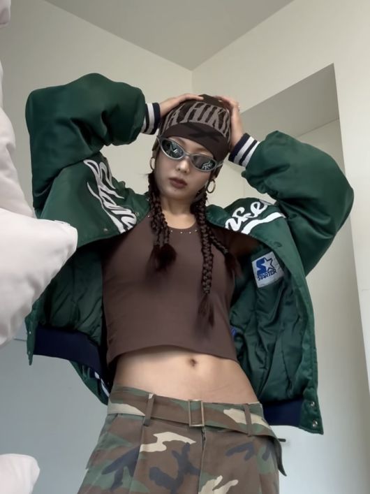 금새록은 스포티하면서도 힙합 무드가 물씬 풍기는 패션 아이템들로 쿄카처럼 자신의 모습을 꾸몄다. 상의로는 짧은 크롭 기장의 브라운 컬러 티셔츠를 입어 과감하게 복근을 드러냈고 하의는 카무플라주 패턴의 카고 팬츠를 매치해 스트리트 감성을 완성했다.