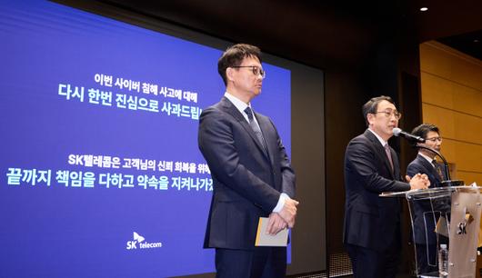 유영상 SK텔레콤 사장(가운데)이 4일 서울 중구 T타워에서 열린 기자간담회에서 5000억원 규모의 '고객 감사 패키지' 시행 계획 등을 설명하는 모습./SK텔레콤 |