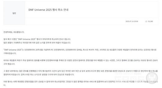 업계 관계자는 "네오플이 준비하던 'DNF Universe 2025' 20주년 오프라인 행사가 갑작스럽게 취소된 배경에는 최근 장기화되고 있는 파업의 영향이 결정적으로 작용한 것으로 보인다. 내부 개발 인력 중 다수가 파업에 참여하고 있어, 행사에서 선보일 콘텐츠 완성도 확보가 사실상 불가능했을 것이다. 네오플 입장에서도 이용자 실망을 최소화하기 위해 온라인 대체 프로그램 등을 준비하고 있지만, 오프라인 행사의 무게감을 대체하긴 어려울 것이다."라고 분석했다.
